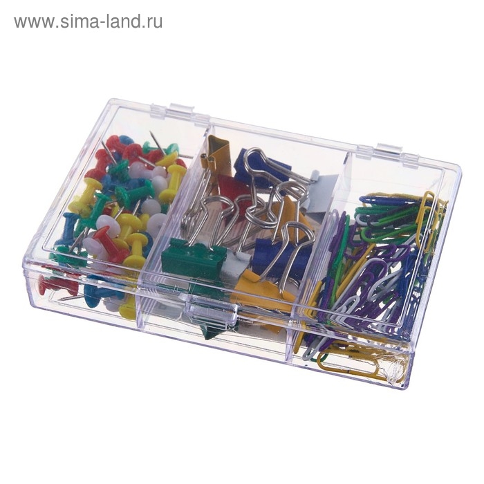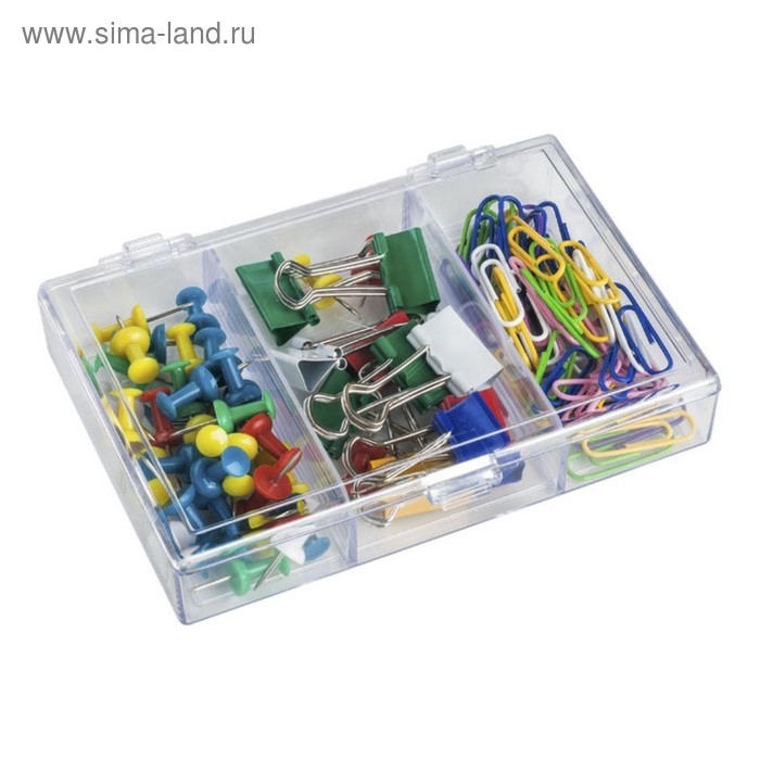 Набор канцелярский из 3-х предметов (скрепки 28 мм цветные - 50 шт., зажимы для бумаг 19 мм цветные - 10 шт., кнопки силовые цветные - 40 шт.)