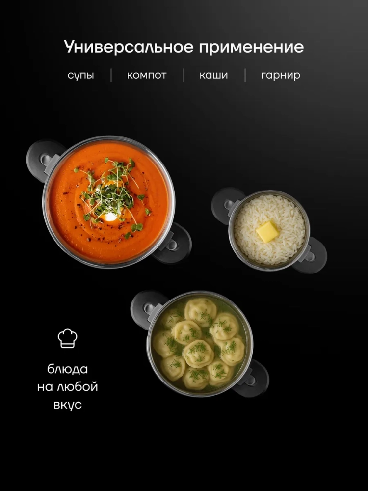 В универсальный поварской комплект для кухни входит 3 кастрюли разного размера с прозрачными крышками: большая глубокая - объем 6,3 литра. Средняя универсальная - объем 3,4 литра. Маленькая компактная - объем 1,4 литра. Посуда подходит для приготовления домашних блюд: мяса, птицы, соусов, супов, картофеля и других овощей методами варки и тушения