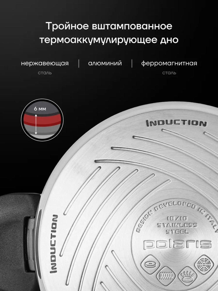 Оригинальный дизайн дна кастрюль разработан в Италии из высококачественного материала с использованием инновационных технологий. Тройное вштампованное термоаккумулирующее дно IMPACT с прослойкой из алюминия обеспечивает равномерный и быстрый нагрев.