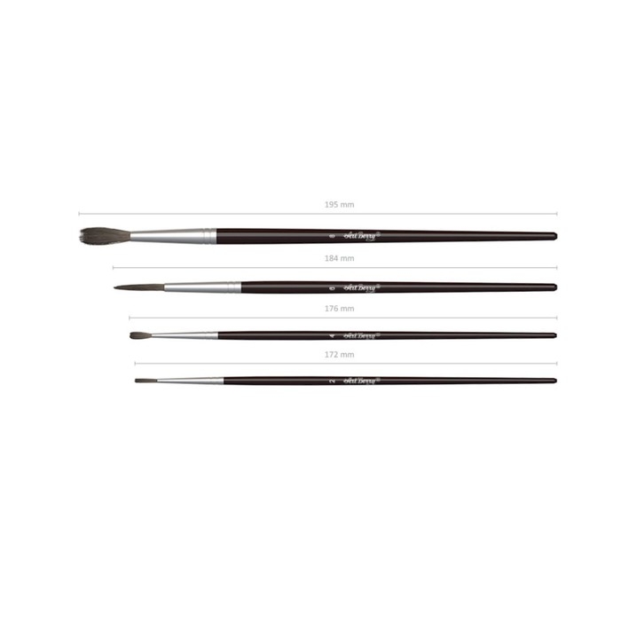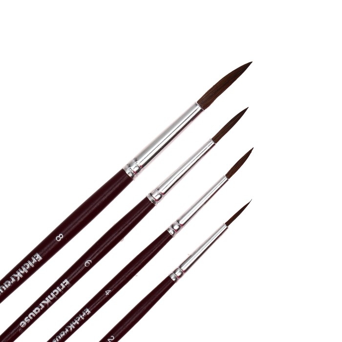 Кисти ArtBerry® для рисования акварельными красками и гуашью. Рабочая часть кисти покрыта гуммирующим составом, защищающим ее при хранении и транспортировке. Ручка изготовлена из натурального дерева и покрыта защитным лаком. Цельнометаллическая бесшовная обойма из алюминия устойчива к коррозии. Круглые 2, 4, 6, 8