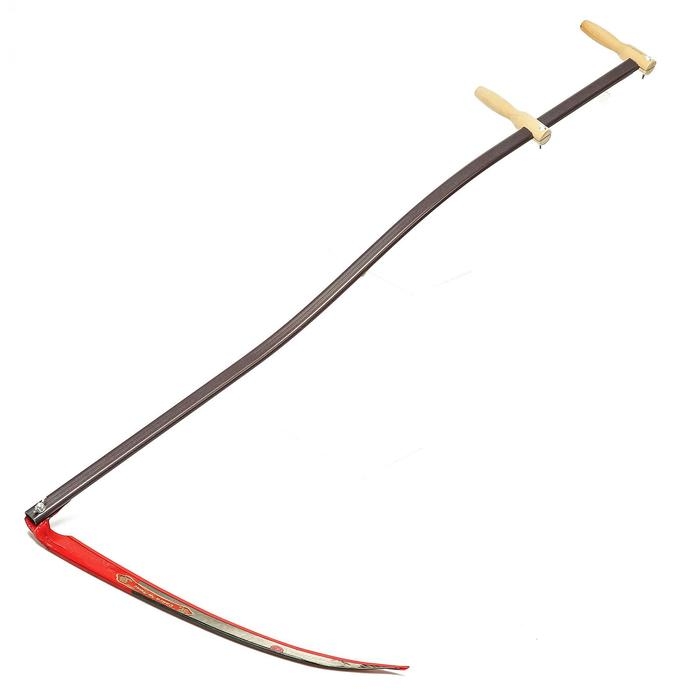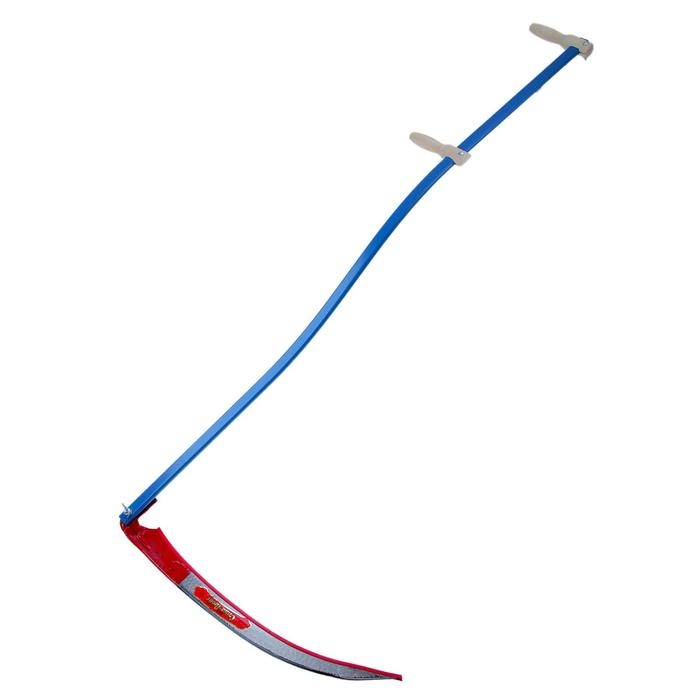 - Косовище из металлической профилированной трубы с двумя деревянными рукоятками. Оно эргономично изогнуто, на конце есть отверстие под монтажный болт для надёжной фиксации полотна.