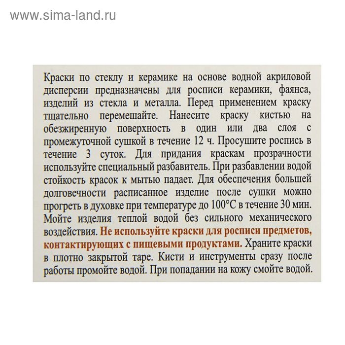 Храните банки плотно закрытыми. Краска высыхает необратимо. При попадании на кожу смойте водой. После высыхания красок расписанное изделие можно мыть в теплой воде без сильного механического воздействия. Не используйте краски для росписи предметов, контактирующих с пищевыми продуктами.