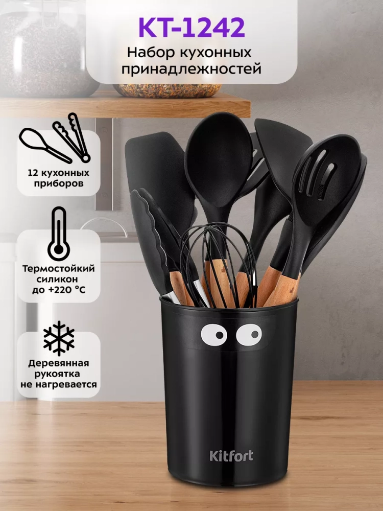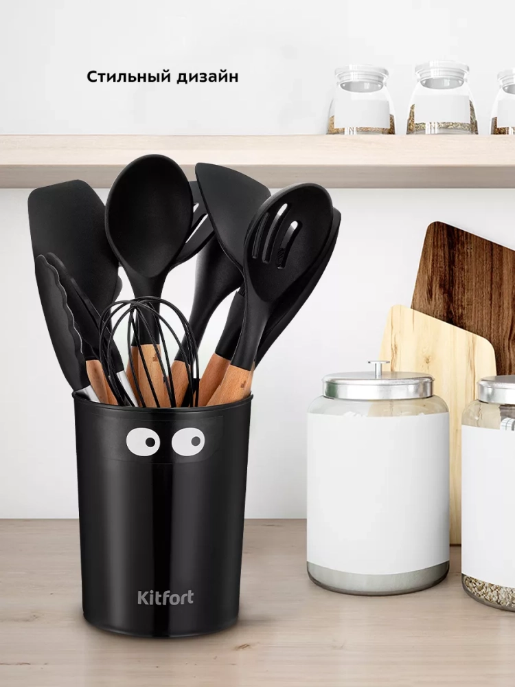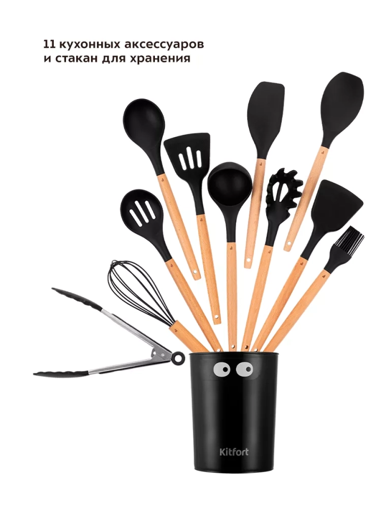 Набор кухонных принадлежностей Kitfort КТ-1242 состоит из стакана для хранения и 11 кухонных аксессуаров: половника, лопатки, лопатки с прорезями, ложки для спагетти, ложки, ложки с прорезями, ложки для выпечки, кулинарного шпателя, кисточки, венчика и щипцов.