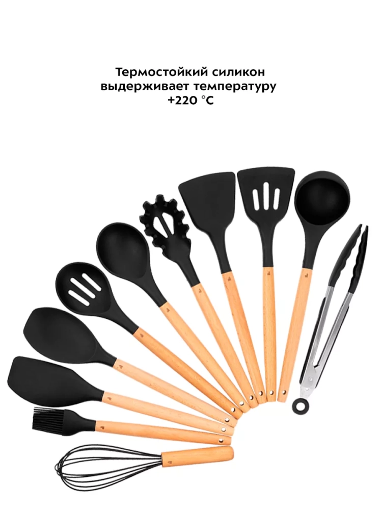 Термостойкий силикон аксессуаров выдерживает температуру +220 °С. Все аксессуары, кроме щипцов, имеют деревянную рукоятку. Деревянная рукоятка не нагревается в процессе готовки, поэтому вы не обожжетесь об нее. Щипцы выполнены из сочетания силикона и нержавеющей стали. Силиконовые вставки на щипцах предотвращают получение ожога, если части из нержавеющей стали нагрелись во время готовки.