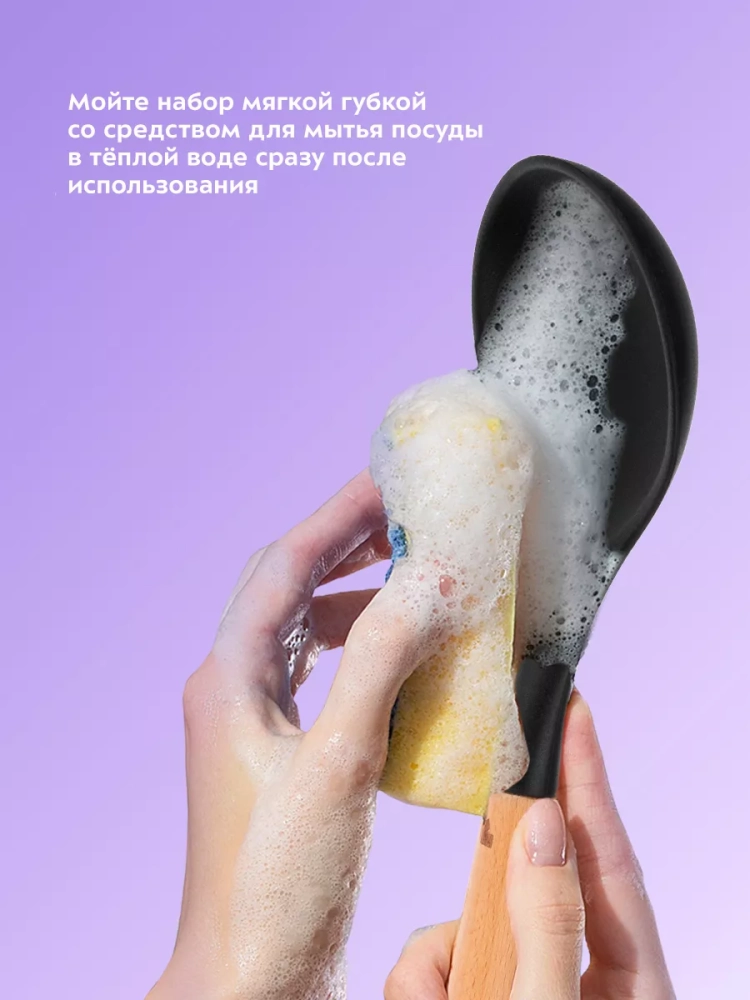 Силикон, из которого выполнены кухонные аксессуары, безопасен для здоровья человека. Силиконовая рабочая поверхность с жестким каркасом не впитывает запахи и не царапает посуду, поэтому кухонные аксессуары из набора можно использовать с тефлоновой и керамической посудой.