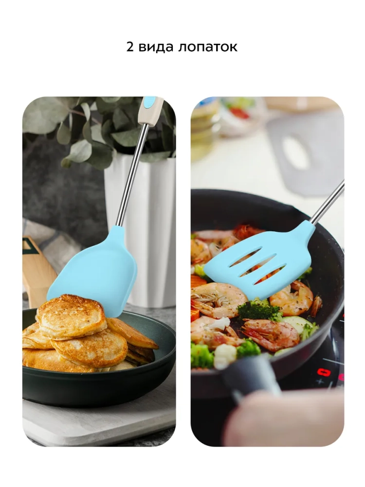 Лопатки используются для того, чтобы поддевать и переворачивать еду на сковороде. Благодаря отверстиям в лопатке с прорезями жир и сок с продуктов остаются в сковороде, когда вы перекладываете готовый продукт из сковороды на тарелку.