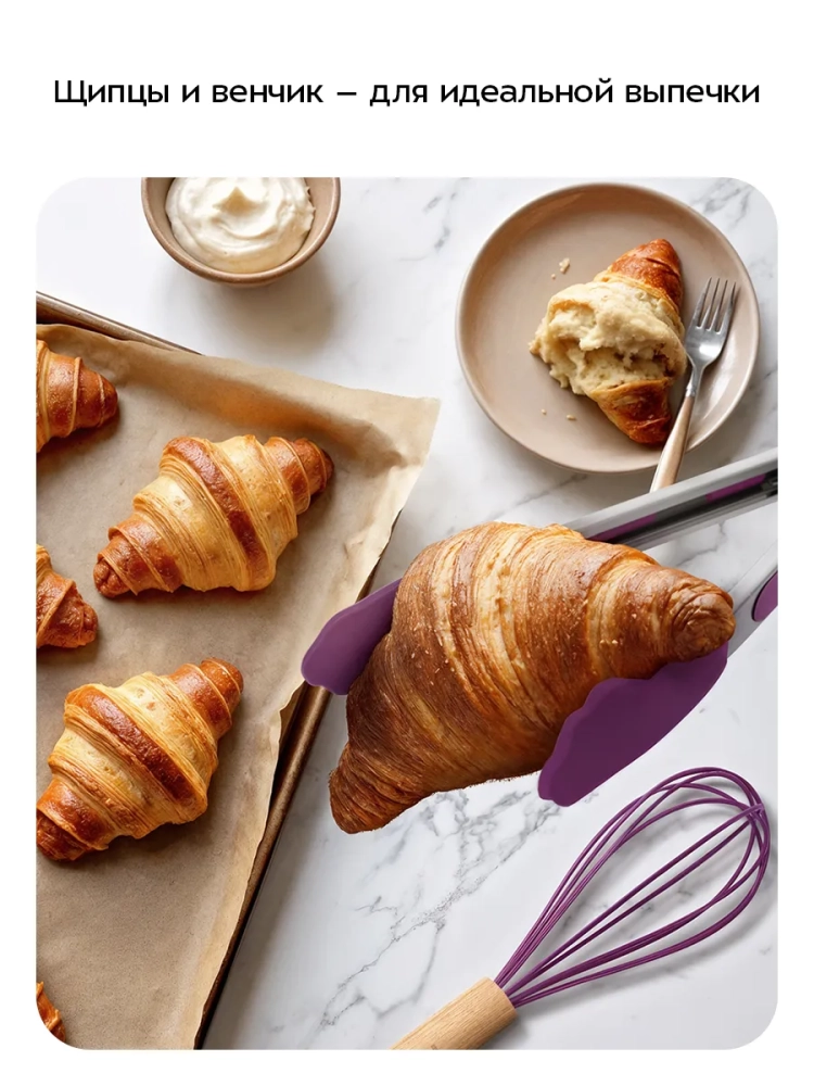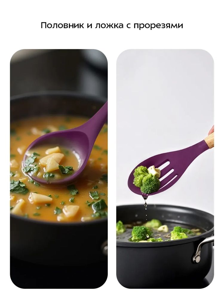 Силикон, из которого выполнены кухонные аксессуары, безопасен для здоровья человека. Силиконовая рабочая поверхность с жестким каркасом не впитывает запахи и не царапает посуду, поэтому кухонные аксессуары из набора можно использовать с тефлоновой и керамической посудой.