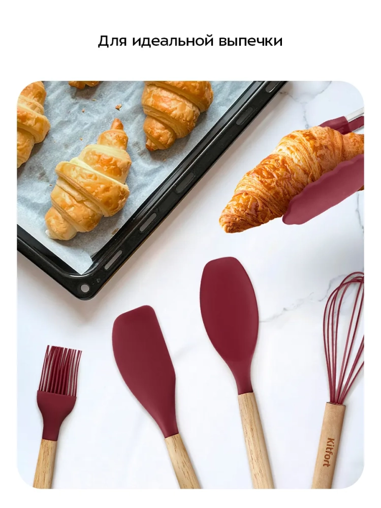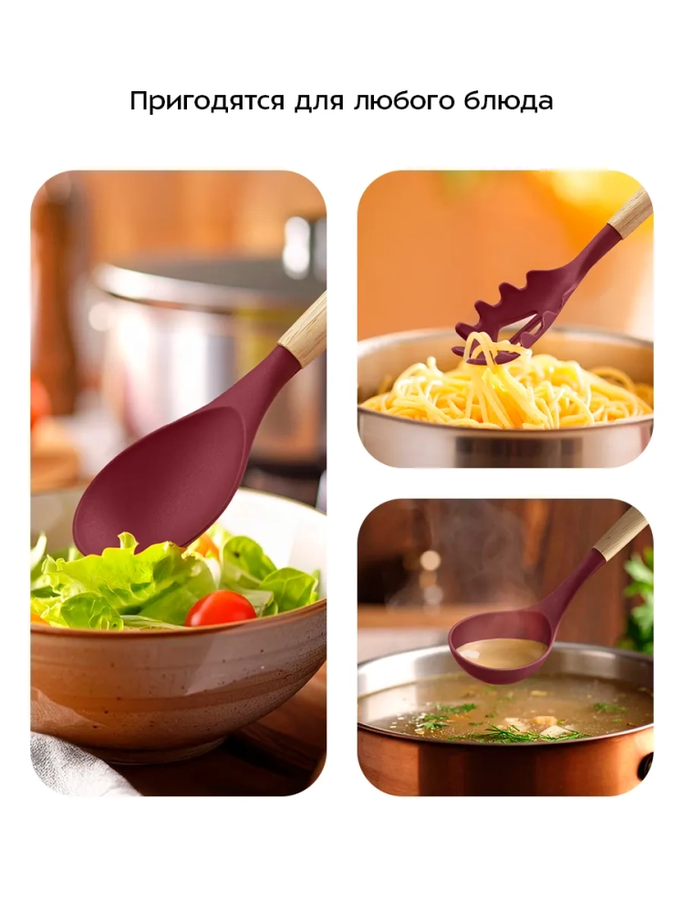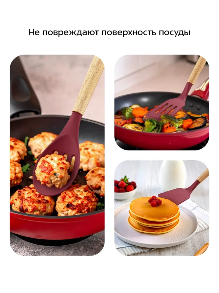 Термостойкий силикон аксессуаров выдерживает температуру +220 °С. Все аксессуары, кроме щипцов, имеют деревянную рукоятку. Деревянная рукоятка не нагревается в процессе готовки, поэтому вы не обожжетесь о нее. Щипцы выполнены из сочетания силикона и нержавеющей стали. Силиконовые вставки на щипцах предотвращают получение ожога, если части из нержавеющей стали нагрелись во время готовки.
