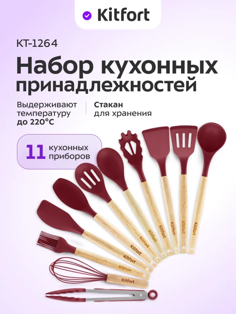 Набор кухонных принадлежностей Kitfort КТ-1264 состоит из подставки и 11 кухонных аксессуаров: половника, лопатки, лопатки с прорезями, ложки для спагетти, ложки, ложки с прорезями, ложки для выпечки, кулинарного шпателя, кисточки, венчика и щипцов.