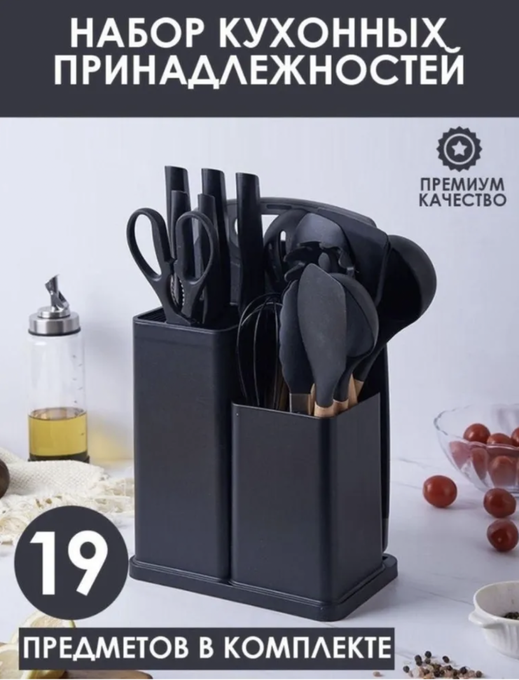 Подставка - 1 шт. Разделочная доска - 1 шт. Нож - 5 шт. Ножницы - 1 шт. Половник- 1 шт Ложка для соусов - 1 шт Ложка для салатов - 1 шт Ложка для пасты - 1 шт Ложка разливная - 1 шт Ложка с прорезью - 1шт Лопатка с прорезью - 1 шт Лопатка для жарки - 1 шт Кисточка кулинарная - 1 шт Венчик - 1шт Кулинарные щипцы- 1 шт