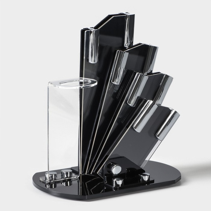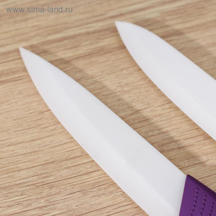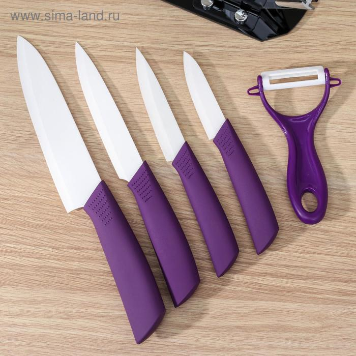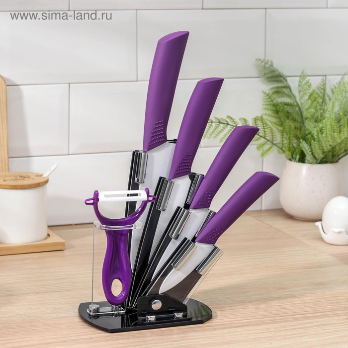 Набор кухонный на подставке Доляна «Симпл», 5 предметов: ножи 7,5 см, 10,5 см, 13 см, 15 см, овощечистка, цвет фиолетовый