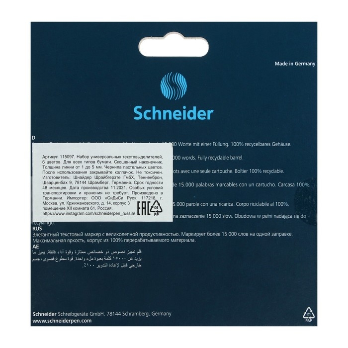 Универсальные текстовыделители Schneider Job имеют светостойкие чернила нежного пастельного цвета на водной основе. Толщина линии письма варьируется от 1 до 5 мм. В наборе 6 цветов: бирюзовый, мятный, лавандовый, розовый, ванильный, персиковый. Schneider Job подходит для различных типов бумаги. Текстовыделители представлены со скошенным наконечником. Диаметр овального пластикового корпуса составляет 24 мм. Цвет колпачка и элементов корпуса соответствует цвету чернил. Упакован в прозрачный чехол.