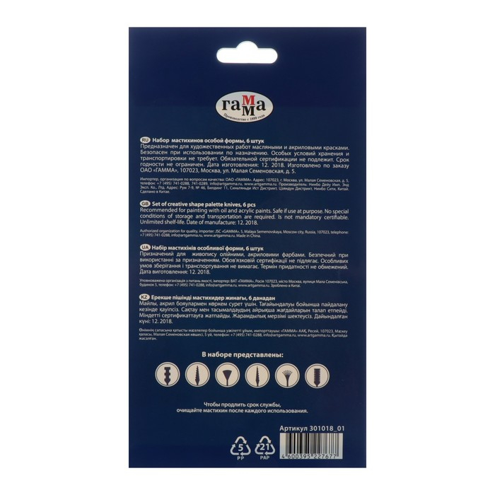 Набор мастихинов 6 штук, "Гамма" "Московская Палитра", фигурные (особые)