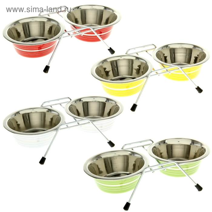 Набор: миска двойная цветная с полосой на подставке VM-3000(G), 2*360 мл предназначена для корма и воды. Имеет удобную форму чашечек, чтобы животное могло вылизывать их полностью, не прилагая усилий. Подставка оборудована нескользящими ножками.