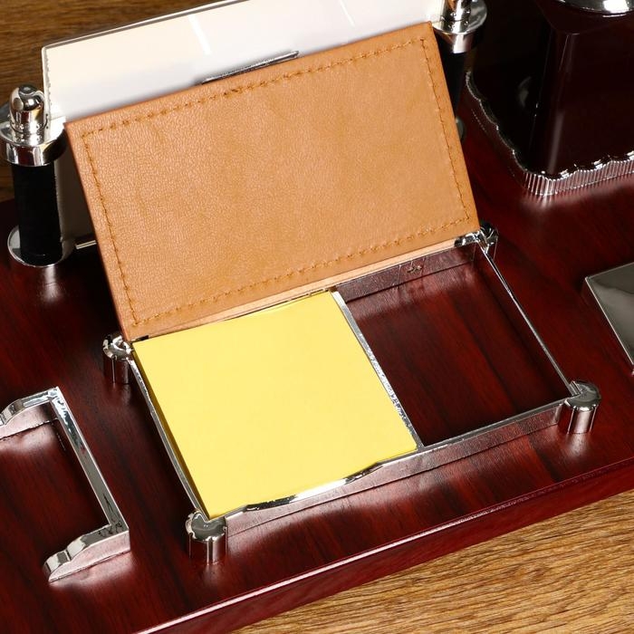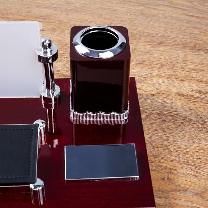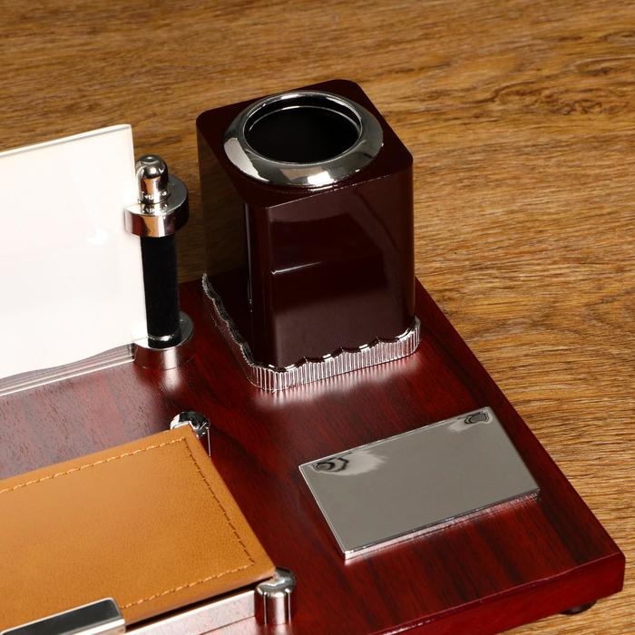 Компактный настольный набор поможет избежать хаоса на рабочем месте. Храните в нём канцелярские принадлежности или другие мелочи, чтобы правильно организовать пространство. К тому же изделие имеет минималистичный дизайн и выполнено под дерево, поэтому оно украсит собой любое место как декоративный элемент.