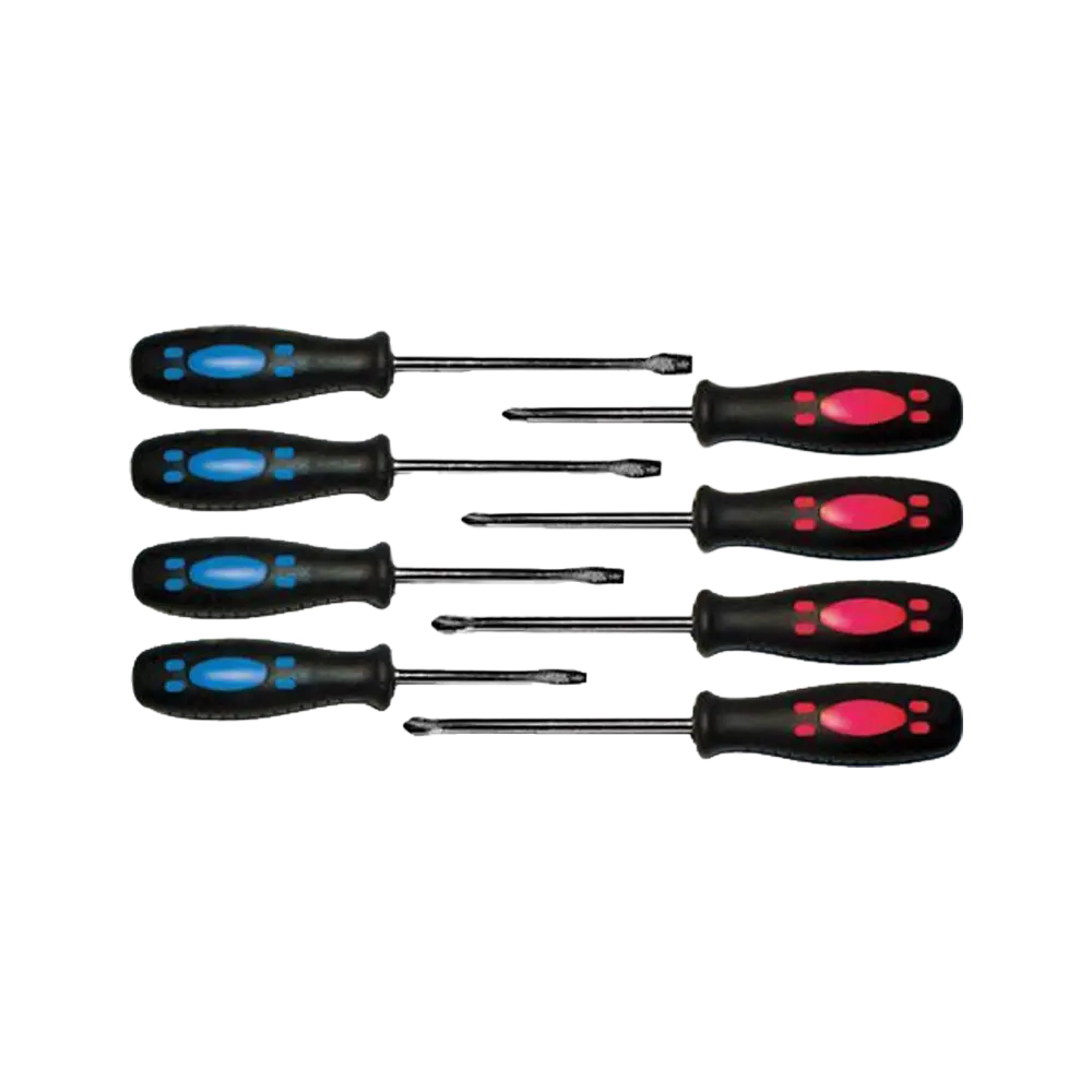 PH0 x 75 мм, PH1 x 100 мм, PH1 x 125 мм, PH2BxB150 мм, SL3 x 75 мм, SL4 x 100 мм, SL5BxB125 мм, SL6 x 150 мм. Материал: жало из хром-ванадиевой стали, магнитный наконечник, прорезиненная ручка. Упаковка: блистер.