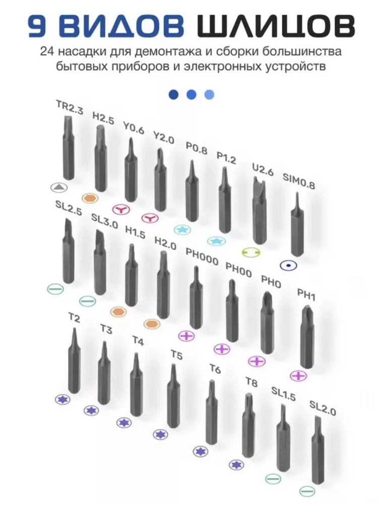 В набор входит 24 высокоточных бит + пластиковый пенал.