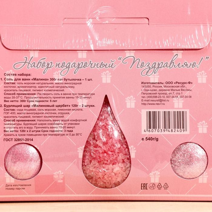 Подарочный набор «Поздравляю!» с хайлайтером станет приятным и полезным подарком для вас и ваших близких! В набор входят: соль для ванн с хайлайтером «Малина», 300 г в пэт-бутылке –1 шт., бурлящий шар «Малиновый щербет», 120 г – 2 шт.