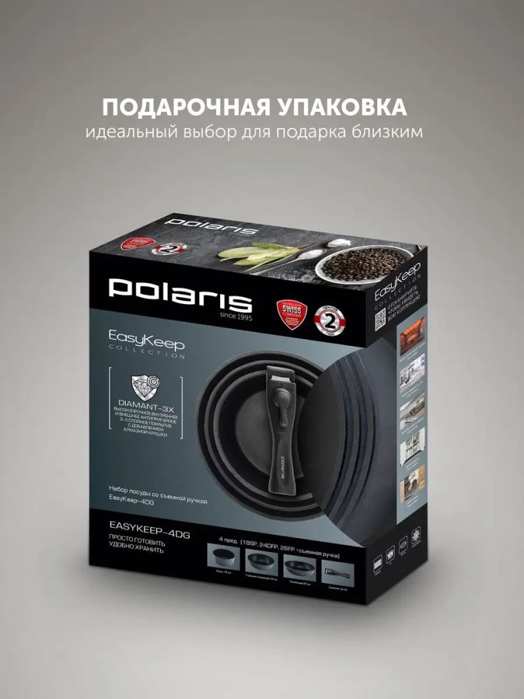 Набор кухонной посуды Polaris EasyKeep-4DG - это идеальный выбор для тех, кто ценит грамотное хранение и универсальность кухонной посуды. Серия Easy Keep - это не только эстетичный внешний вид и современный дизайн, но и многофункциональность! Вся продукция от Polaris известна своей надежностью, долговечностью и соответствует высочайшим европейским стандартам качества. Профессиональные кухонные принадлежности изготовлены из прочного и качественного материала - кованого алюминия. Алюминиевая посуда намного легче и практичнее в уходе, чем изделия из чугуна и нержавеющей стали.