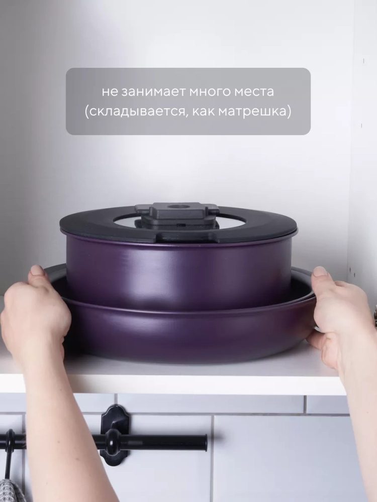 В универсальный набор для кухни входит: Две большие сковороды (24/26см) для жарки, которые можно использовать с минимальным количеством масла, благодаря антипригарному покрытию. Кухонный ковш и кастрюля (16/20см) подходят для варки и тушения мяса и птицы, соусов, каши, а также картофеля и других овощей. Съемная бакелитовая ручка с двойной защитой, которая не скользит и не нагревается. Две стеклянные крышки универсального диаметра с силиконовым ободом и складной ручкой для удобного хранения (16/18/20см и 24/26см) Подвесные кухонные принадлежности: кулинарная ложка, лопатка и шумовка. Все аксессуары выполнены из высококачественного экологичного пластика. Пластиковые крышки для удобного хранения готовых блюд в холодильнике.(16/20/24/26см.)