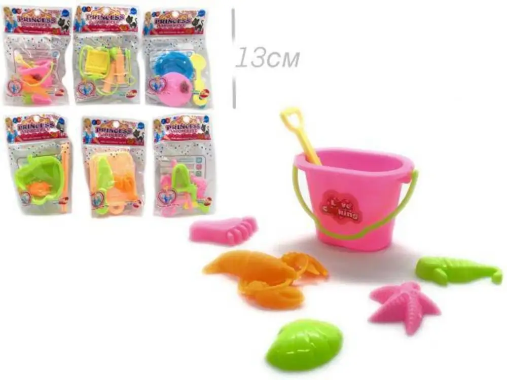 Набор посуды состоит из 7 предметов - ведро, лопатка, 5 формочек 2 -5,5 см. 12 видов наборов. В ассортименте. Без выбора. Размер набора 9 х12 см.