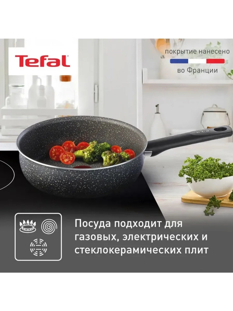 Кухонные сковородки Тефаль подходят для приготовления на газовых, электрических и стеклокерамических плитах. С целью создания товаров высокого качества и безопасных для потребителей, в посуде используются материалы, которые не содержат PFOA, свинец и кадмий при нанесении на поверхность посуды. Порадуйте себя и своих близких полной коллекцией из серии Natural Cook: в коллекцию входят сковороды разных диаметров (22 см, 24 см, 26 см, 28 см), а также сковорода вок 24 см и сковорода для блинов 22 см.