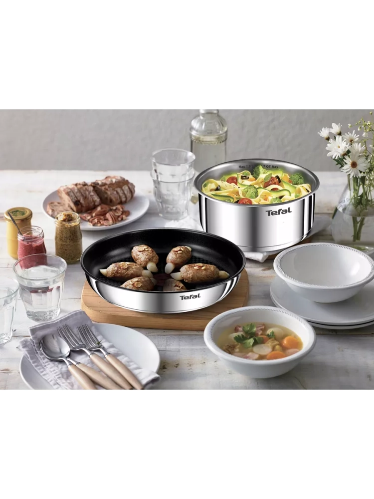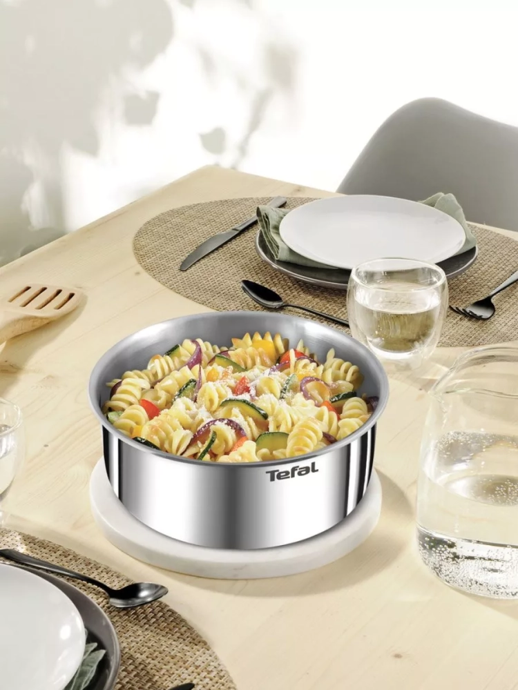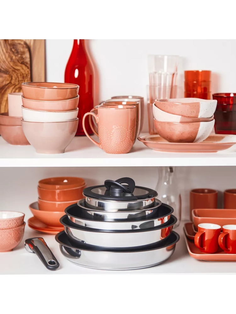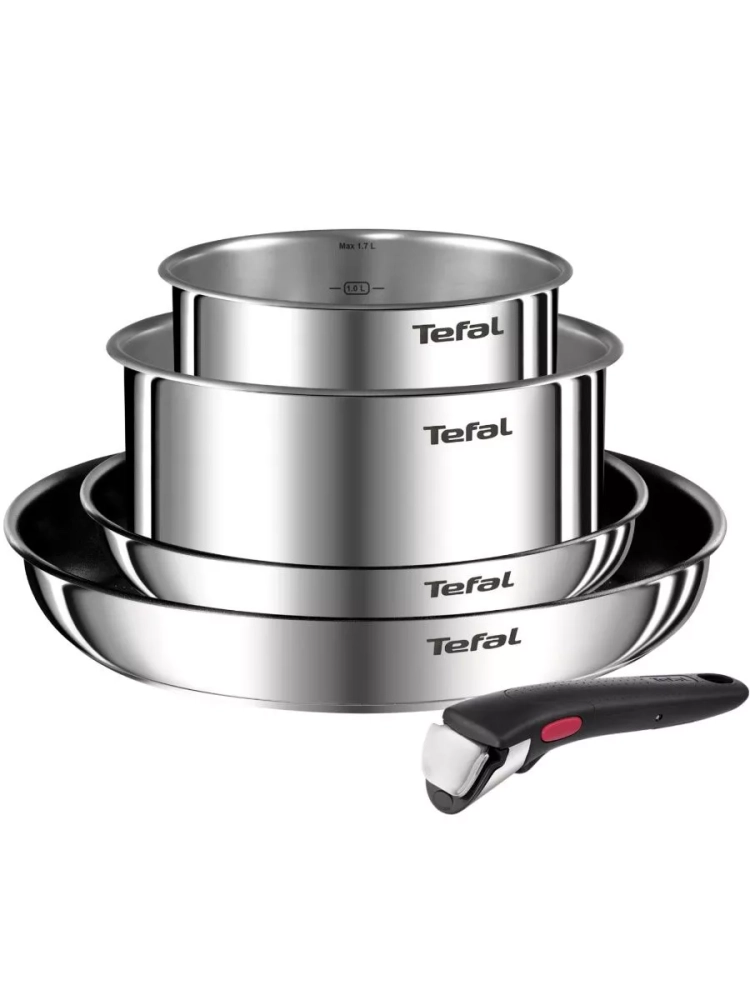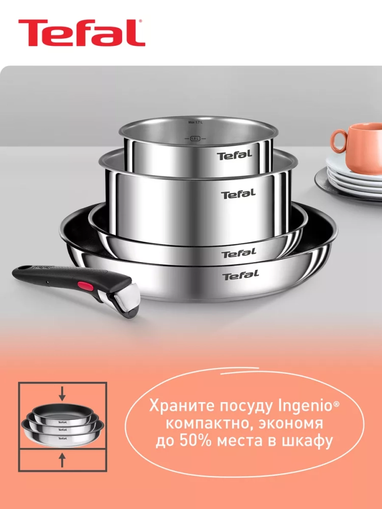 Набор посуды со съемной ручкой Tefal Ingenio Emotion L897S574. Новая серия посуды Ingenio создана, чтобы вы могли каждый день без лишних усилий добиваться превосходных результатов на кухне. Превратите сковороду или ковш в форму для запекания или емкость для хранения в холодильнике с помощью изящной съемной ручки, которая легко отсоединяется в одно движение.