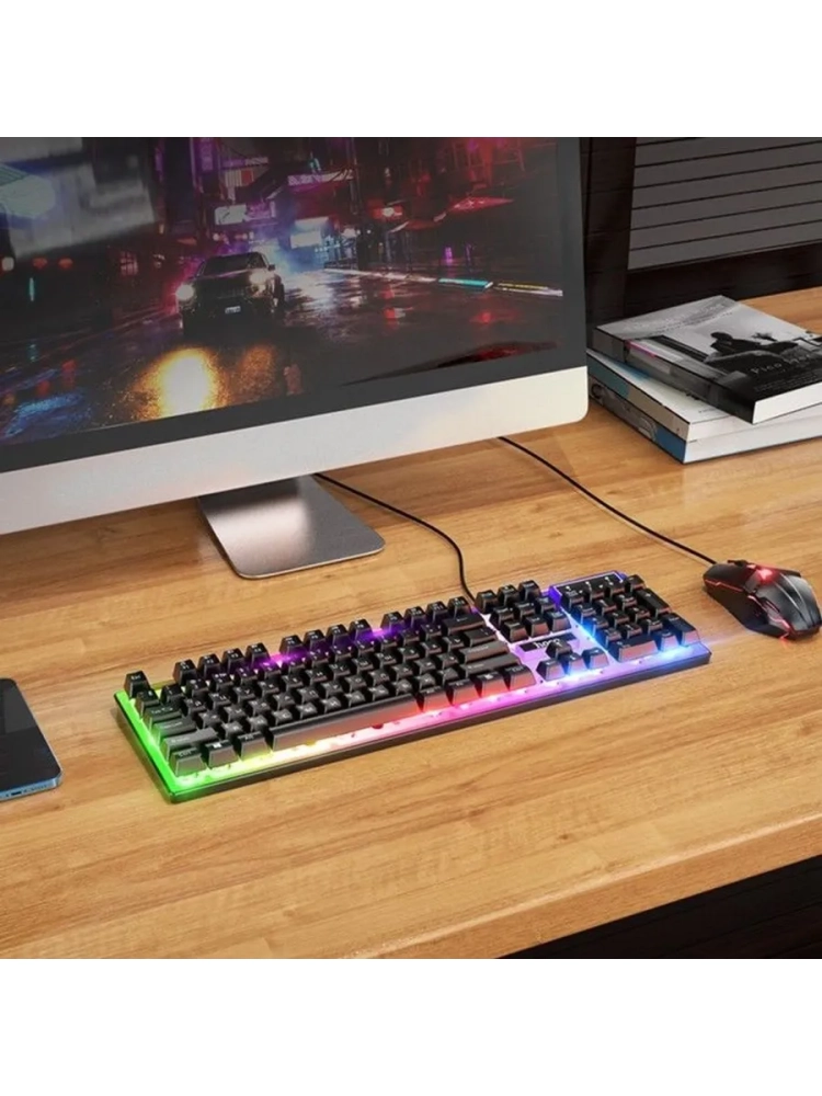 Комплект клавиатуры и мыши Hoco GM18 — это идеальный выбор для геймеров, которым важна точность, комфорт и стиль. В комплект входят игровая мембранная клавиатура и мышь с лазерным сенсором, обеспечивающие отличную производительность и высокую скорость отклика.Клавиатура выполнена в скелетном дизайне с 104 клавишами, что делает её лёгкой и удобной для длительных игровых сессий. Мембранные переключатели гарантируют мягкость и тишину нажатий, а подсветка добавляет эстетический акцент и помогает играть в темноте. Подключение через USB-интерфейс обеспечивает стабильную работу без задержек.Мышь с 5 кнопками и разрешением сенсора от 800 до 1200 dpi отлично справляется с любыми задачами, от точных движений в шутерах до быстрого перемещения по рабочим пространствам. Лазерный сенсор обеспечивает отличную чувствительность и высокую точность.Точная настройка: мышь с лазерным сенсором (800-1200 dpi) для точных движений в любой игре.Удобство и стиль: скелетная клавиатура с мембранными клавишами для комфортного набора текста и игры.Подсветка: атмосферная подсветка клавиш, идеально подходящая для игры в темноте.Простой интерфейс: подключение через USB для стабильного соединения без задержек.Эргономичный дизайн: удобная и практичная мышь с 5 кнопками для различных игровых задач.Клавиатура и мышь Hoco GM18 — это сочетание качества, эргономики и эстетики, которое идеально подходит как для любителей игр, так и для тех, кто ценит комфорт в работе и развлечениях.