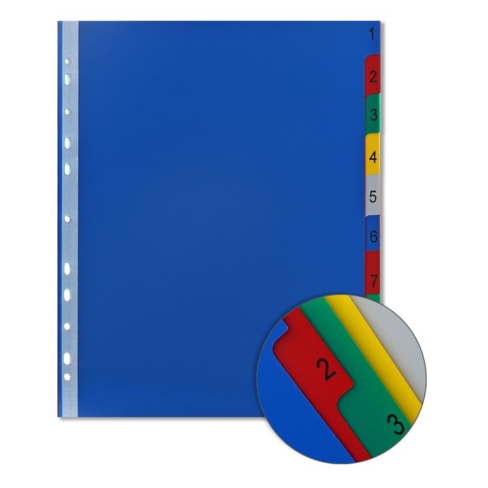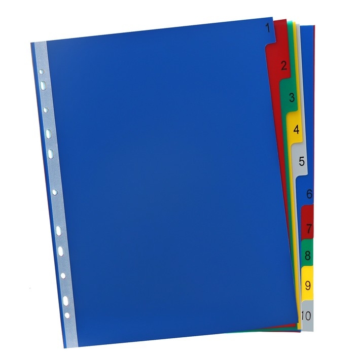 Разделители помогут Вам комфортно сортировать, архивировать и систематизировать любые документы внутри папок разного вида. Они выполнены из прочного пластика и имеют универсальную перфорацию для подшивки в папки.