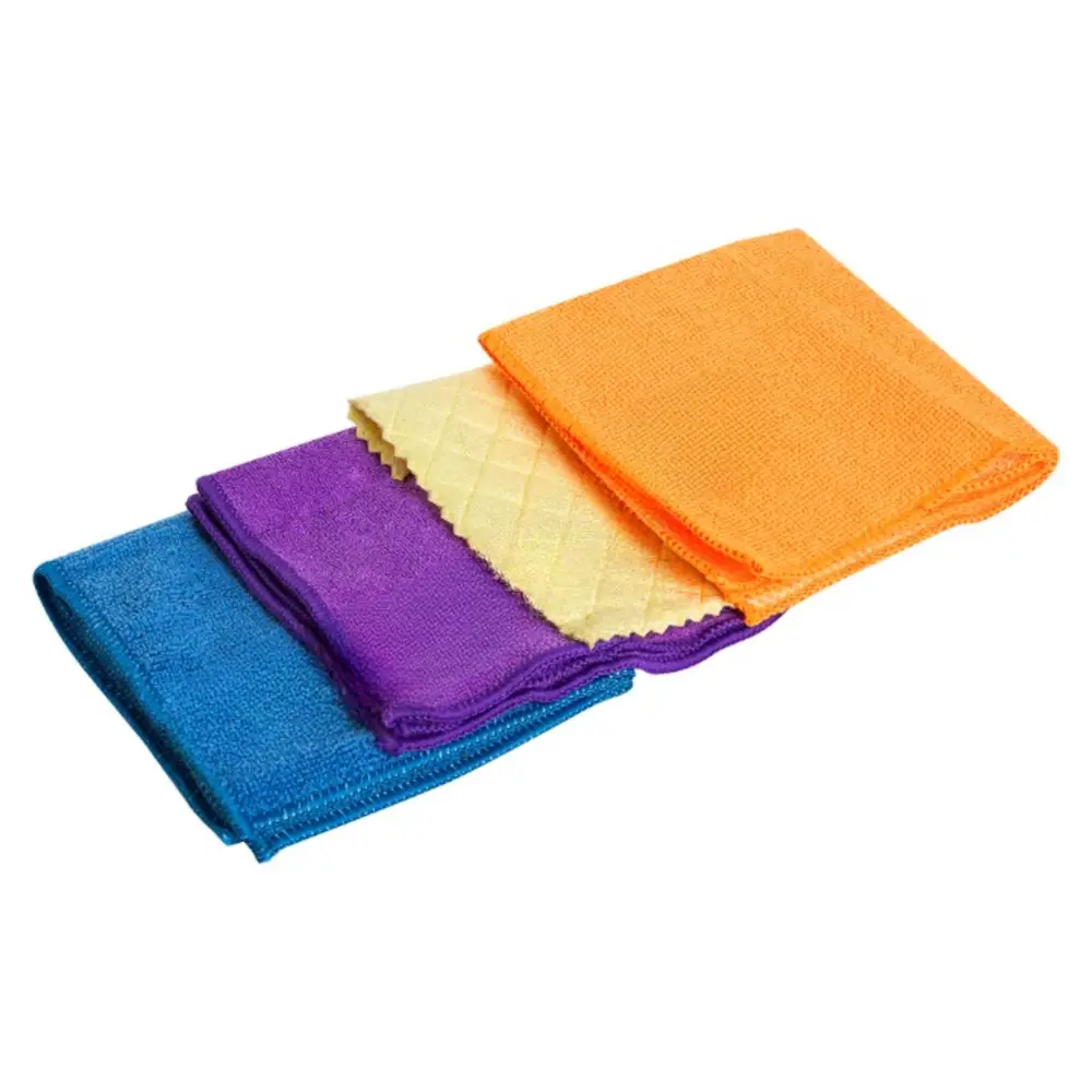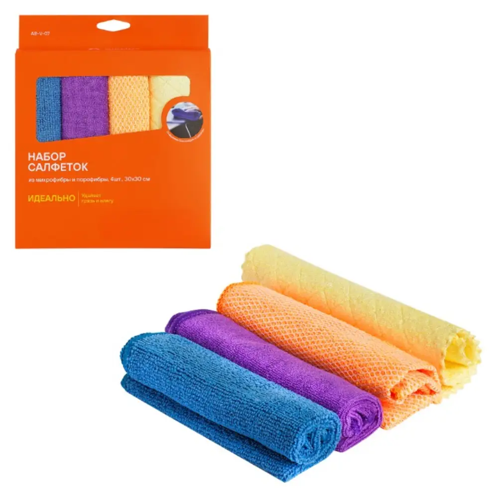 В набор изделий для уборки входят 4 салфетки различных цветов, упакованные в картонную коробку. Салфетки состоят из микрофибры, которая отличается повышенными влаговпитывающими показателями. Салфетка из порофибры представляет сочетание двух материалов в одном изделии: мягкий и обильно впитывающий влагу поролон соединен с микрофибровой тканью. Особая поверхность салфеток способна не только устранить загрязнения с плоскости, но и отполировать поверхность изделия. Комплектация: салфетка из микрофибры 30*30 см - 2 шт., сафлетка из микрофибры и коралловой ткани 30*30 см - 1 шт., салфетка из порофибры - 1 шт.