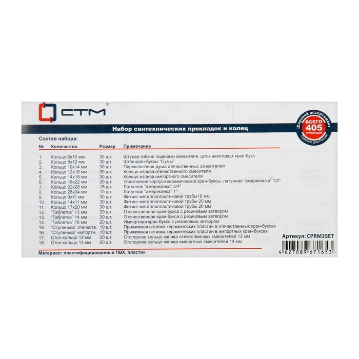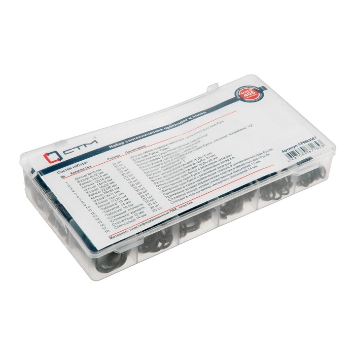 Набор предназначен для смесителей и бытовой сантехники. В комплект входит 405 прокладок, 18 видов. Набор упакован в специальный прозрачный пластиковый кейс с разделителями, благодаря чему прокладки удобной переносить и хранить.