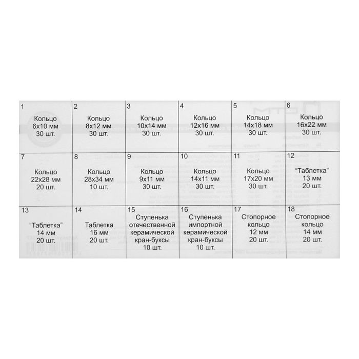 Комплектация: "таблетка" 13 мм (20 шт.), "таблетка" 14 мм (20 шт.), "таблетка" 16 мм (20 шт.), "ступенька" отечественная (10 шт.), "ступенька" импортная (10 шт.), стопорное кольцо 12 мм (20 шт.), стопорное кольцо 14 мм (20 шт.), кольцо 6x10 мм (30 шт.), кольцо 8x12 мм (30 шт.), кольцо 10x14 мм (30 шт.), кольцо 12x16 мм (30 шт.), кольцо 14x18 мм (10 шт.), кольцо 16x22 мм (5 шт.), кольцо 22x28 мм (20 шт.), кольцо 28x34 мм (10 шт.), кольцо EPDM 9x11 (30 шт.), кольцо EPDM 11x14 (30 шт.), кольцо EPDM 17x20 (30 шт.).