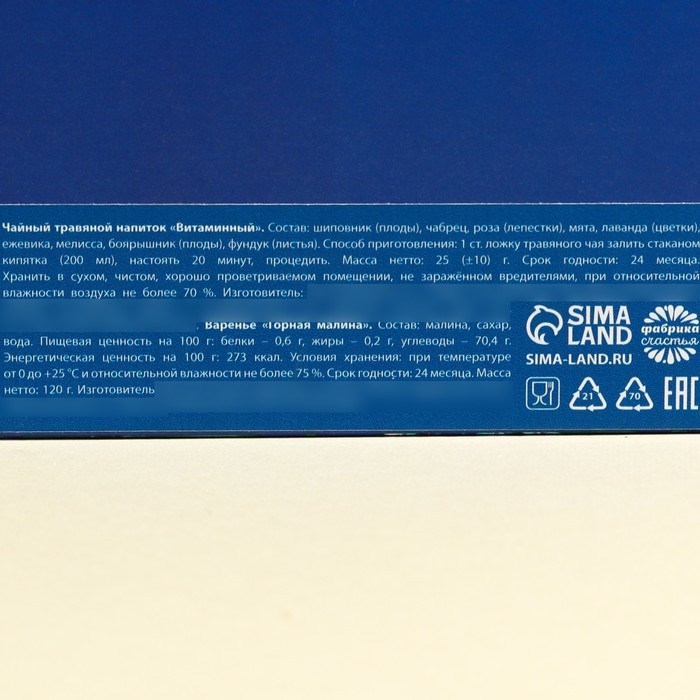 Чай травяной "Витаминный" Состав: шиповник (плоды), чабрец, роза (лепестки), мята, лаванда (цветки), ежевика, мелисса, боярышник (плоды), фундук (листья). Способ приготовления: 1 ст. ложку травяного чая залить стаканом кипятка (200 мл), настоять 20 минут, процедить.Срок годности: 24 месяцаМасса нетто: 25 г. Варенье "Горная малина" Состав: малина, сахар, вода. Срок годности: 24 месяца Масса нетто: 120 г.