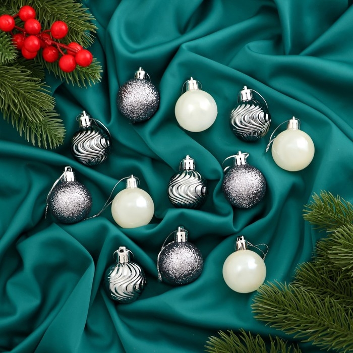 Набор шаров пластик d-4 см, 12 шт "Мелодия" волны блеск, белый серый