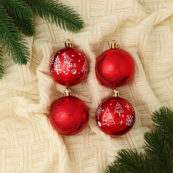 Набор шаров пластик d-5,5 см, 4 шт "Новогодние забавы" геометрия снежинки, красный