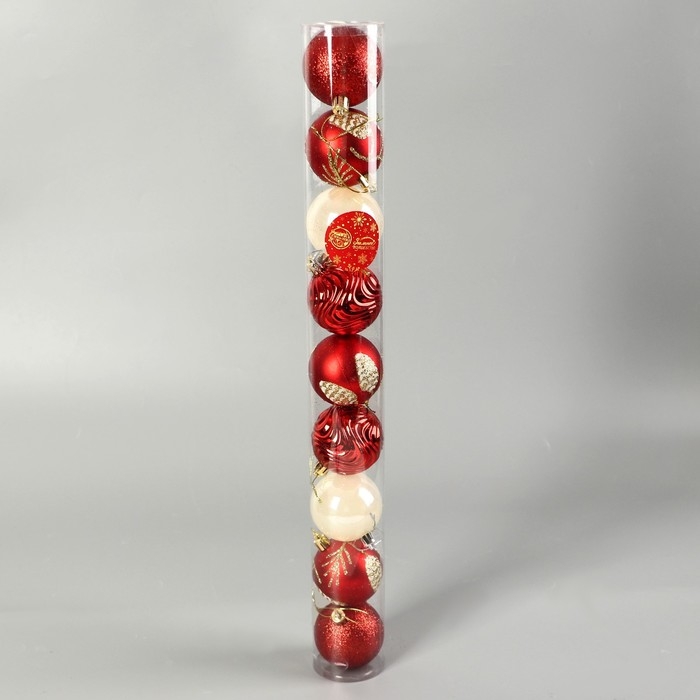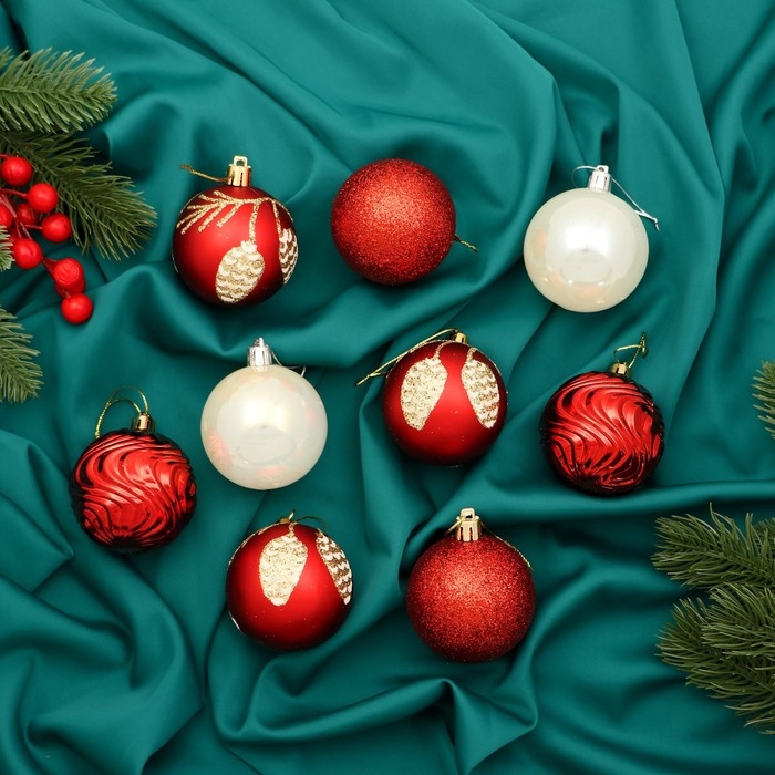 Набор шаров пластик d-6 см, 9 шт "Мелодия" волны ёлочки, красный белый