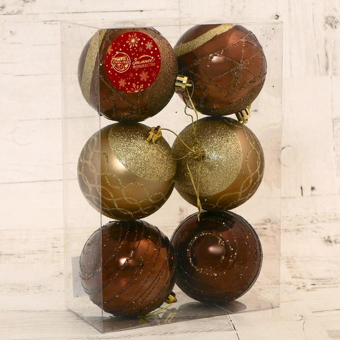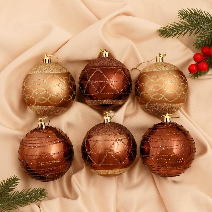 Набор шаров пластик d-8 см, 6 шт "Корнелия узоры ассорти" золотисто-коричневый