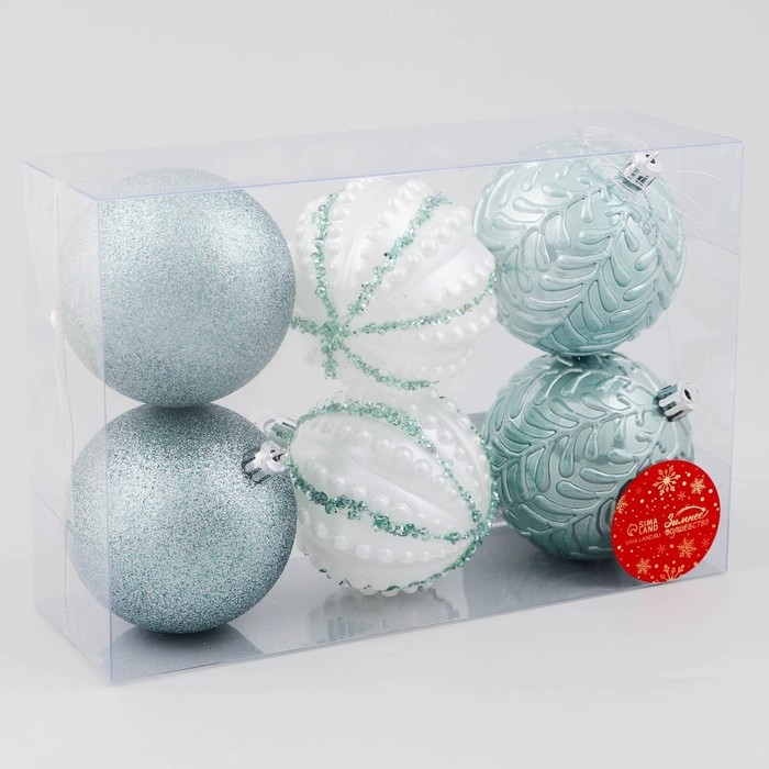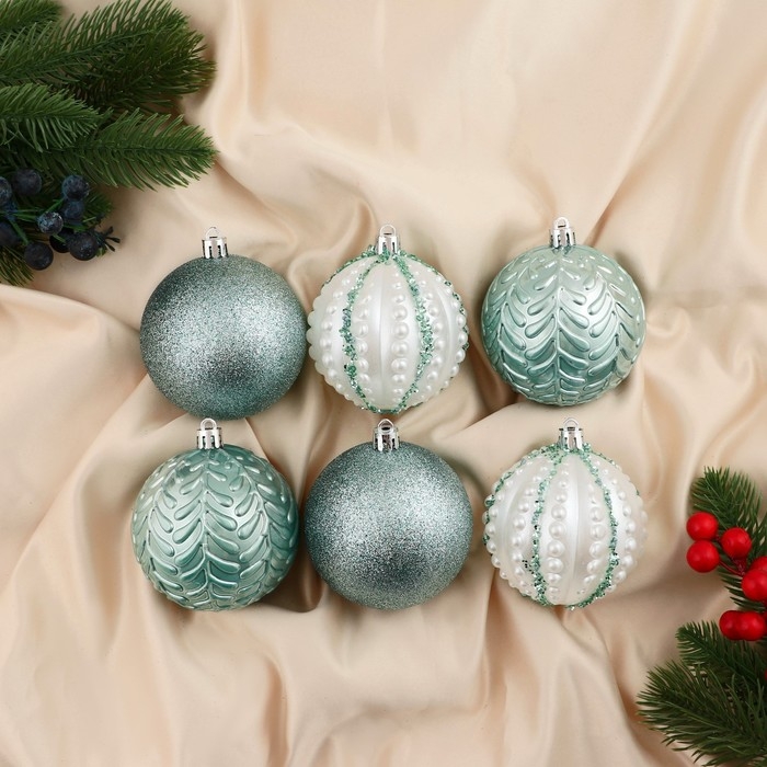 Набор шаров пластик d-8 см, 6 шт "Ночка" веточки узор, зелёный белый