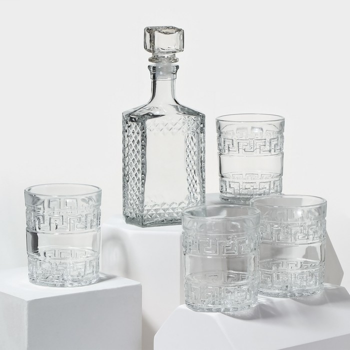 Набор состоит из стеклянного штофа и четырёх стаканов. Посуда изготовлена из прочного высококачественного стекла. Изделия выполнены в оригинальном дизайне и имеют красивый рельеф.