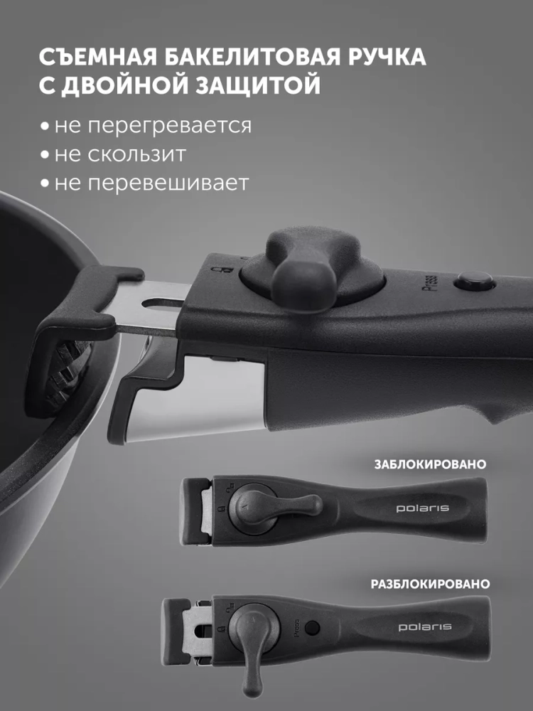 Съемная бакелитовая ручка с двойной защитой, которая не скользит и не нагревается.