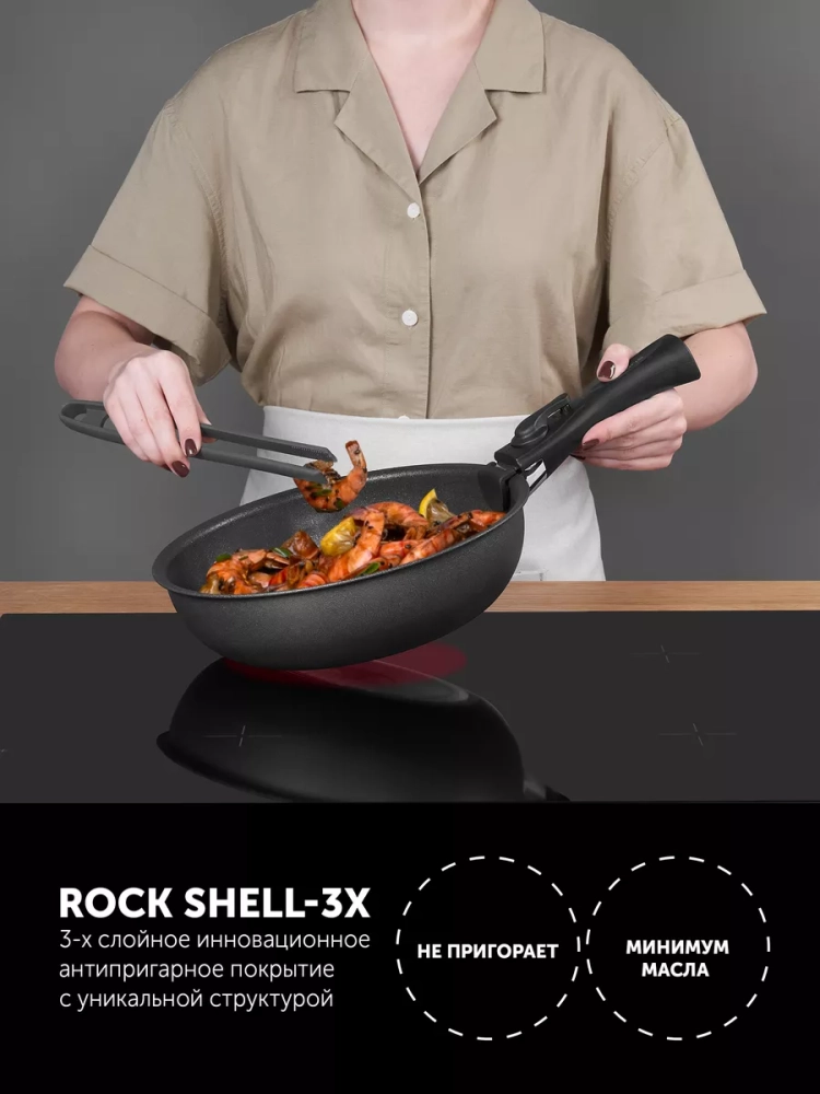 Трехслойное инновационное антипригарное покрытие ROCK SHELL-3X с уникальной структурой для приготовления с минимальным количеством масла обеспечивает быстрое нагревание посуды и равномерное распределение тепла во время приготовления пищи. Это поможет избежать возможного пригорания, которое может возникнуть при готовке на сковороде из нержавеющей стали или чугуна. Посуда подходит для использования на индукционной, электрической, керамической, газовой плите и запекания в духовке.