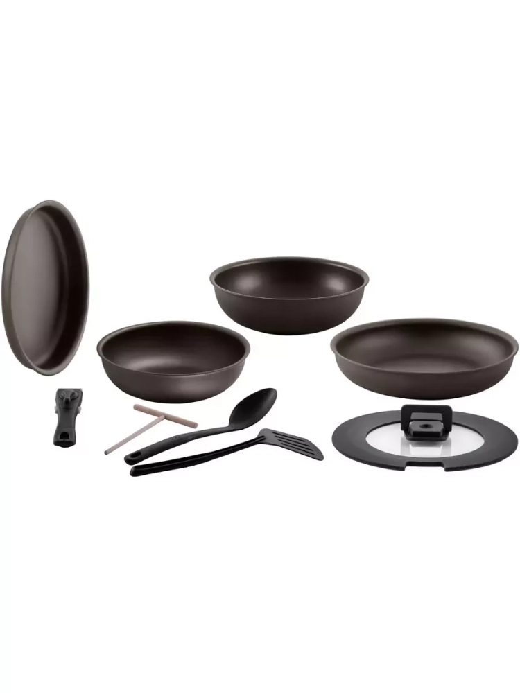 В универсальный набор для кухни входит: Две сковороды (24см и 26см) для жарки, которые можно использовать с минимальным количеством масла, благодаря антипригарному покрытию. Большая глубокая сковородка ВОК (26см) для варки и тушения мяса и птицы,а также картофеля и других овощей. Блинница (22 см). Блинная сковорода уникальной формы создана для вкусного и быстрого завтрака: воздушные панкейки, оладьи, яичница и омлет. Вы сможете без труда приготовить любимые блюда. Съемная бакелитовая ручка с двойной защитой, которая не скользит и не нагревается. Стеклянная крышка универсального диаметра 24-26 см со специальной выемкой для съемной ручки для удобного хранения. Подвесные кухонные принадлежности: лопатка и ложка из высококачественного пластика и деревянный распределитель теста в форме палочки для раскатки идеально ровных блинов.