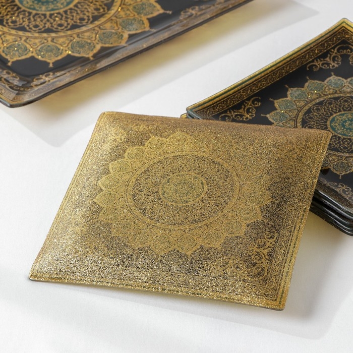 Набор столовый «Мехенди», 7 предметов: d=30 см - 1 шт, d=18 см - 6 шт, цвет золотой, черный. Набор столовый состоит из семи предметов: блюда d=30 см и шести тарелок d=18 см. Все предметы изготовлены из качественного стекла и имеют орнамент в восточном стиле. Тарелки прекрасно подойдут для сервировки праздничного стола, для семейного ужина или обеда.