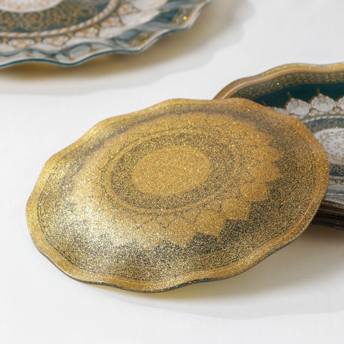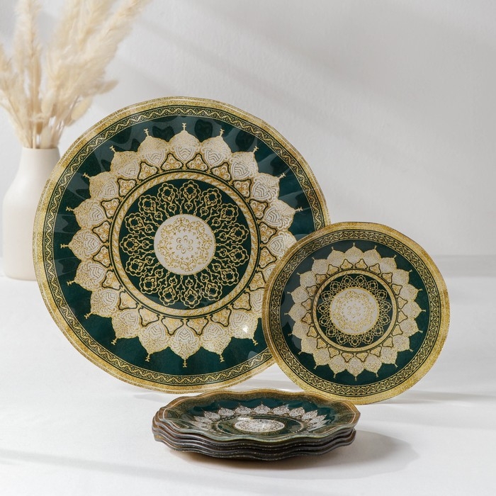 Набор столовый «Мехенди» состоит из 7 предметов: большого блюда и 6 тарелок. Посуда сделана из иранского стекла. Набор имеет восточный узор и подойдёт для праздничного стола. Большое блюдо можно использовать для подачи горячего, например, плова, а маленькие тарелки — для различных закусок.