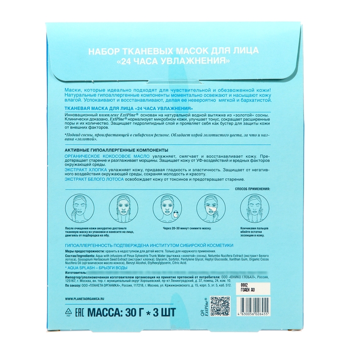 Набор тканевых масок для лица Planeta Organica "Aqua Splash 24 часа Увлажнения"