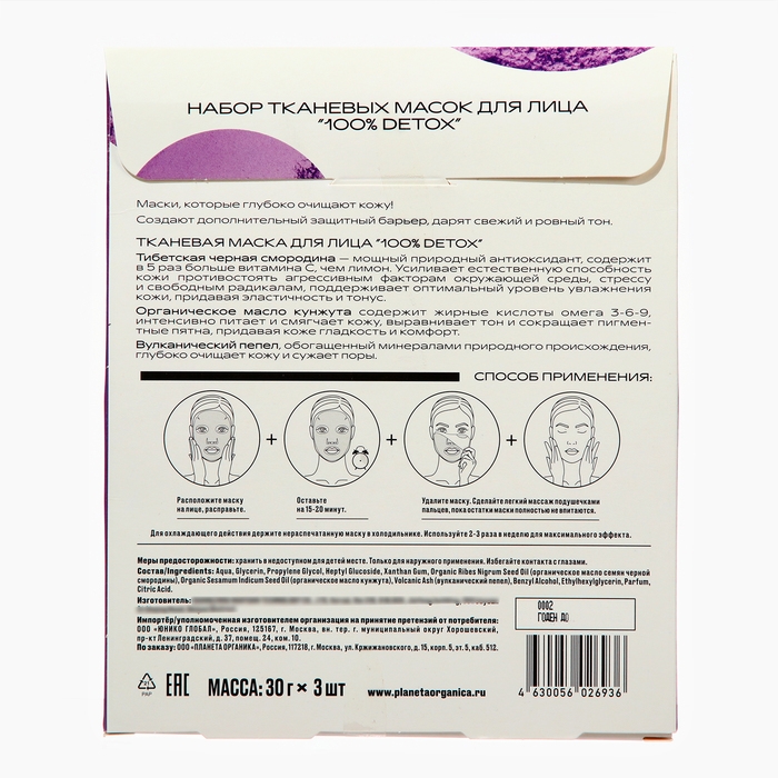 Тканевая маска для лица "100% DETOX"Загрязнения мегаполиса вредны для кожи. Детокс-маска для лица создана специально для глубокого очищения, создает дополнительный защитный барьер, дарит свежий и ровный тон кожи. Тибетская черная смородина — мощный природный антиоксидант, содержит в 5 раз больше витамина С, чем лимон. Усиливает естественную способность кожи противостоять агрессивным факторам окружающей среды, стрессу и свободным радикалам, поддерживает оптимальный уровень увлажнения кожи, придавая эластичность и тонус. Органическое масло кунжута содержит жирные кислоты омега 3-6-9, интенсивно питает и смягчает кожу, выравнивает тон и сокращает пигментные пятна, придавая коже гладкость и комфорт. Вулканический пепел, обогащенный минералами природного происхождения, глубоко очищает кожу и сужает поры.