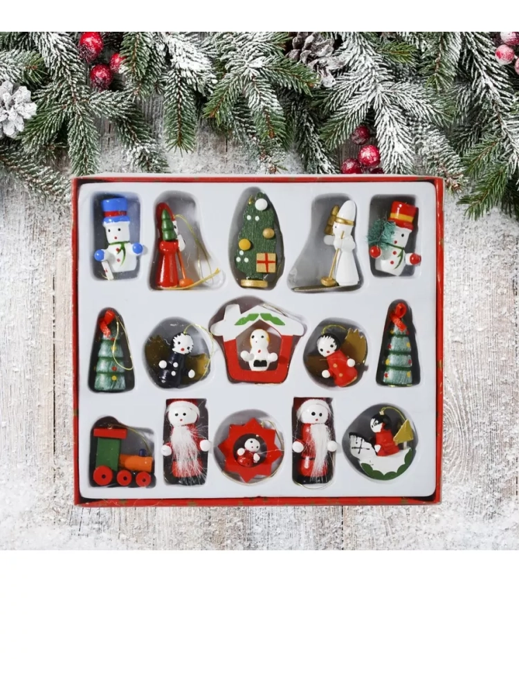 Набор ярких игрушек из дерева 15 шт, для декорирования ели или интерьера поможет быстро, просто и со вкусом нарядить Вашу рождественскую елку, а также, послужит новогодним подарком родственникам, друзьям, коллегам. Елочные украшения имеют актуальные цвета, что позволяет им потрясающе смотреться как на зеленой, так и на белой хвое поблескивая в свете новогодней гирлянды.