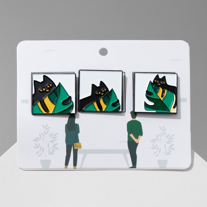 Набор значков (3шт) "Кот" прячущийся, цветной в чёрном металле