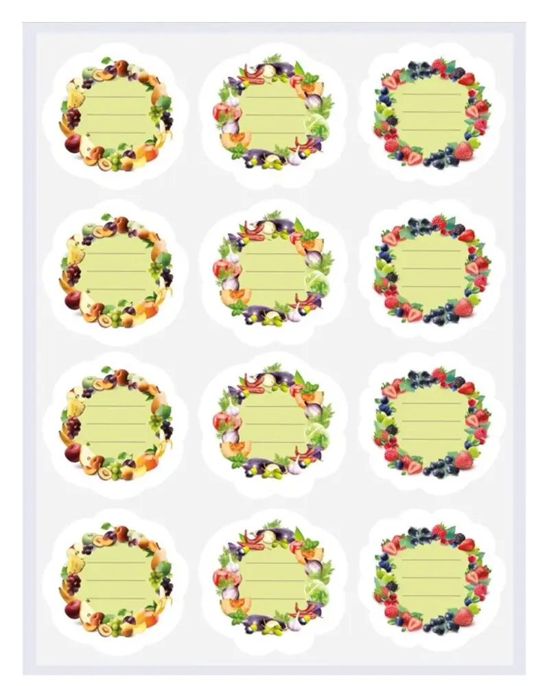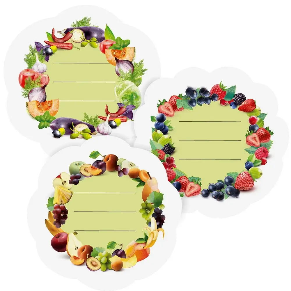 Самоклеящиеся наклейки предназначены для маркировки банок с овощными заготовками, салатами, вареньем, компотами. Также подойдут для маркировки крышек, контейнеров и баночек со специями и крупами. С помощью ярких наклеек вы сможете сохранить информацию о домашней заготовке, и указать дату изготовления. Клеить можно на любые не слишком рельефные поверхности. Поверхность должна быть чистая, сухая и обезжиренная. Наклейки расположены на листе, прорезаны по контуру, снимите ее с подложки и нанесите на поверхность.