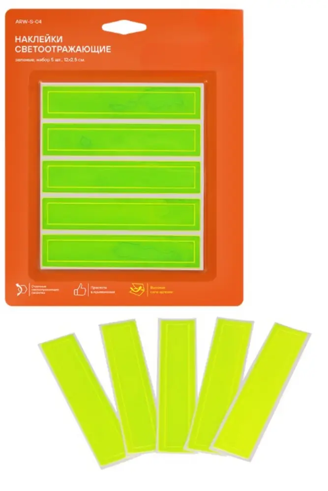 Набор из пяти наклеек со световозращающим покрытием. Предназначены для крепления на различных предметах и одежде для улучшения видимости на дальнем расстоянии в темное время суток.